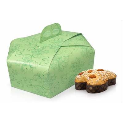 Scatola porta colomba artigianale color verde, realizzata in cartoncino resistente ed ecologico, ideale per valorizzare e proteggere colombe pasquali di pasticceria e laboratorio artigianale. Il design elegante e vintage la rende perfetta sia per vendite al dettaglio che per confezioni regalo.