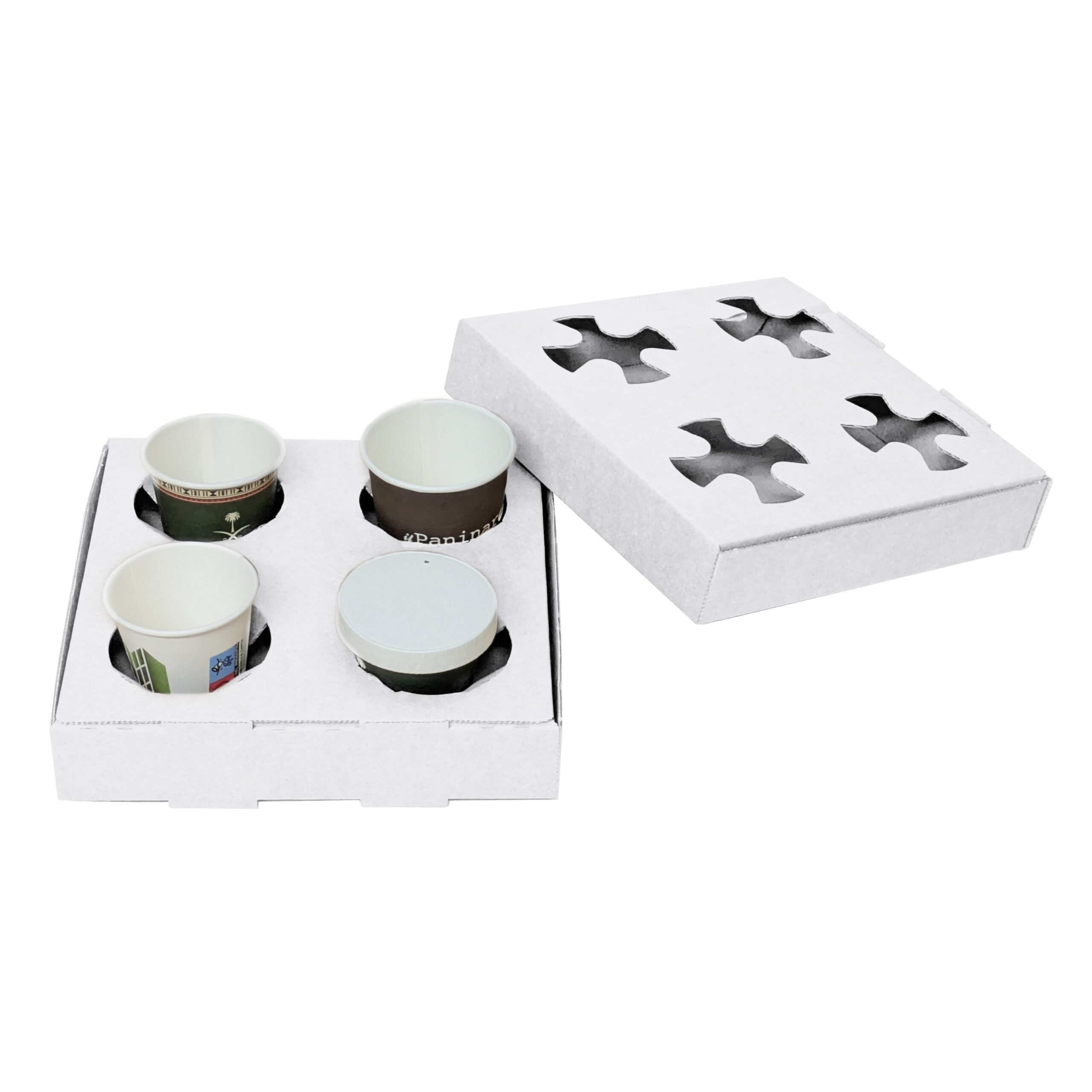 Porta bicchieri in cartone ondulato bainco , riciclabile nella carta. Divisibile in due per portare 2 bicchieri per sezione, è possibilie inserire all interno bicchieri da caffe , cappuccino e drink Personalizzabile con logo lato fronte e sulla parte superiore.| Colore | Bianco |