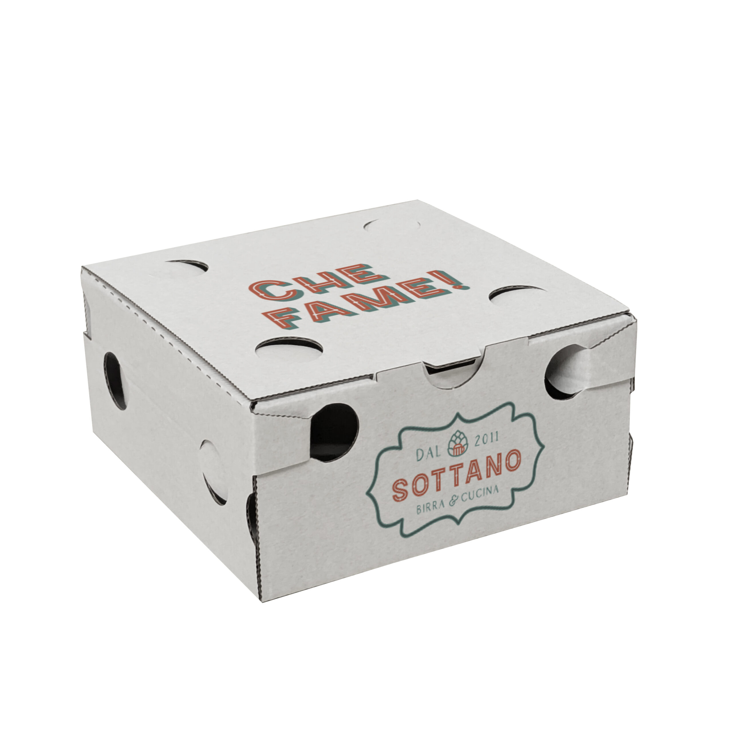 Le scatole in cartone per alimenti personalizzate con logo e grafica sono la scelta ideale per friggitorie, pizzerie d’asporto, pescherie con cucina, street food, rosticcerie e panifici che vogliono distinguersi con un packaging pratico e unico.