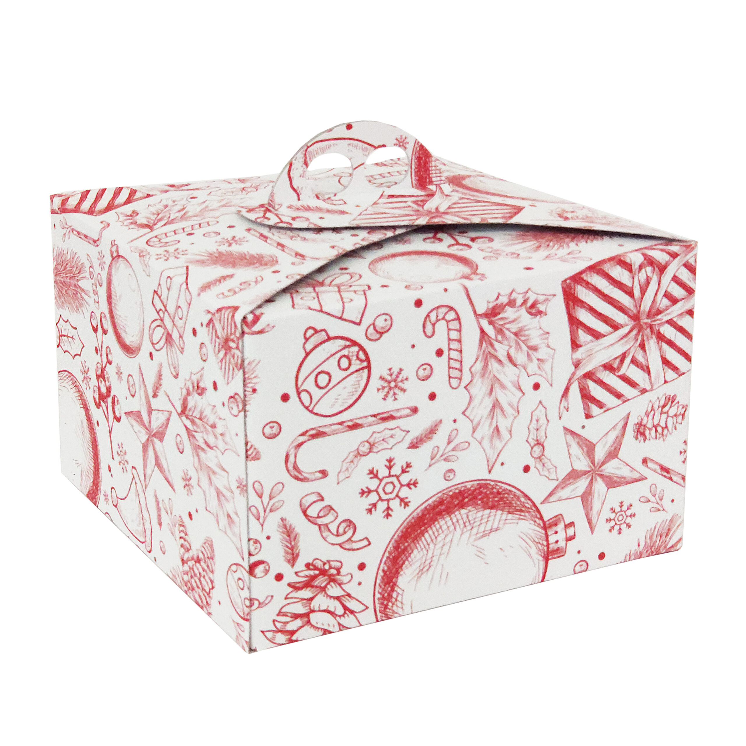 Scatola porta panettone in cartoncino bassa, decorata con grafica. Ideale per trasporto sicuro di alimenti, protegge dall'umidità. Ecologica e riciclabile.| Caratteristiche | Bassa |