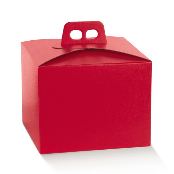 Scatola porta panettone in cartone fibra rosso. Ideale per confezioni di prodotti gastronomici e idee regalo grazie al pratico manico. Si adatta al trasporto di panettoni di varia misura: 750g; 1000g basso| Capacità | 1000 g, 750g |
