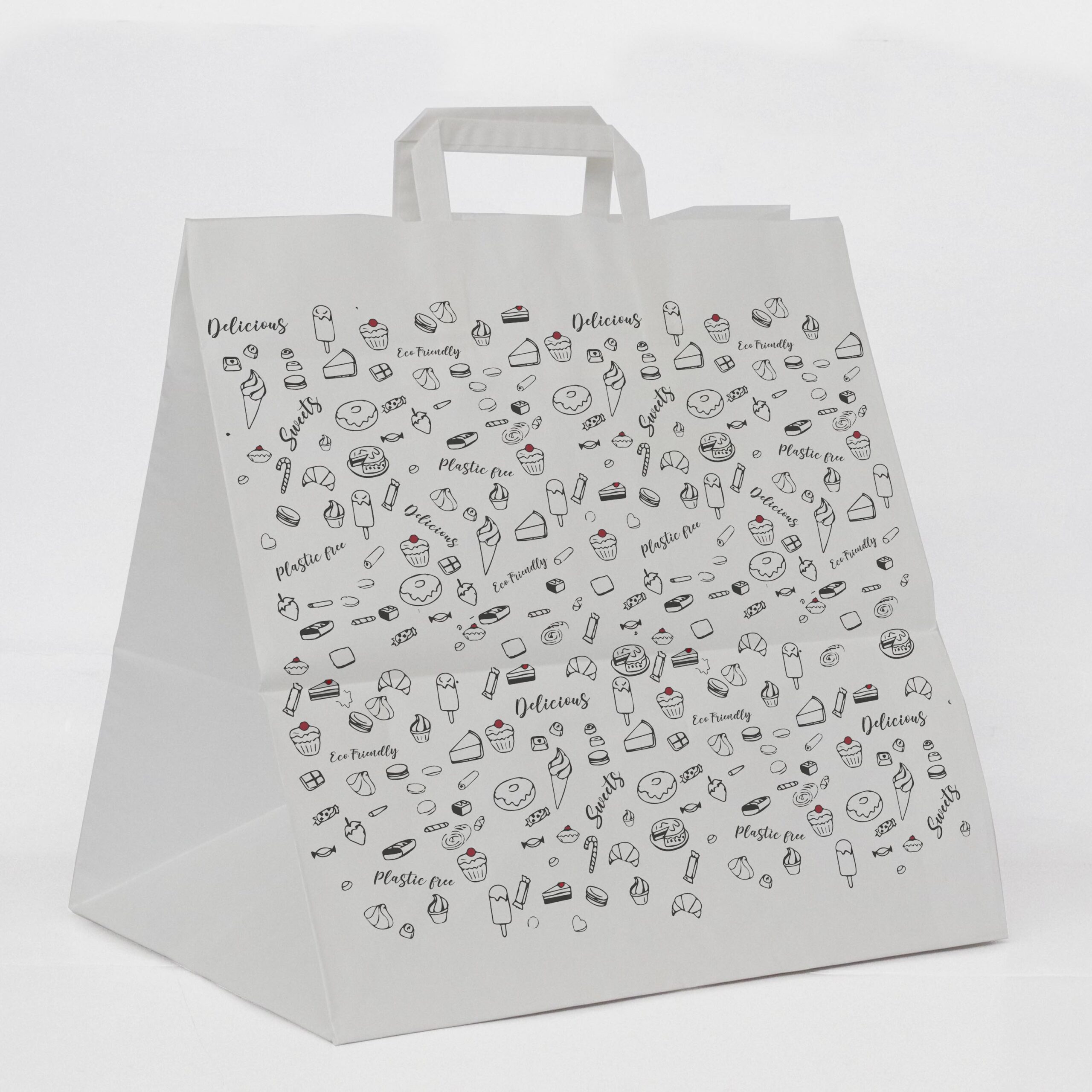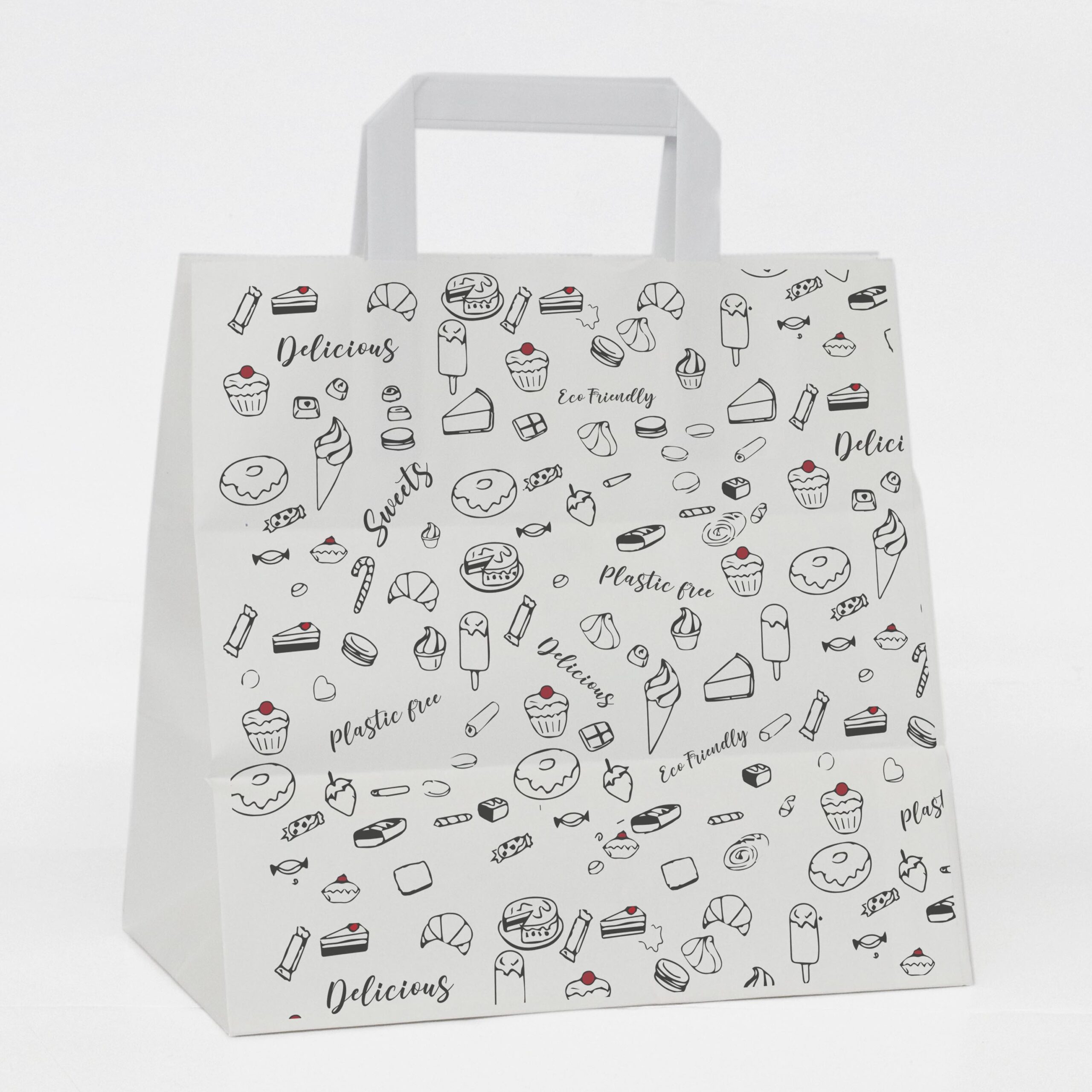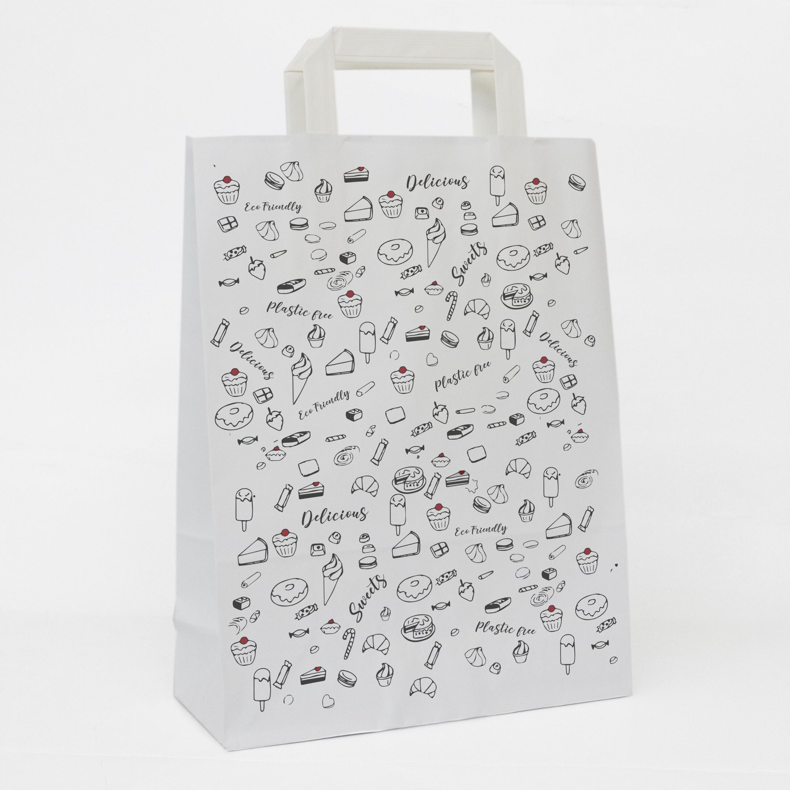 50pz Shopper in Carta Kraft Bianco Stampa sweet Manico Piattina – Varie Misure