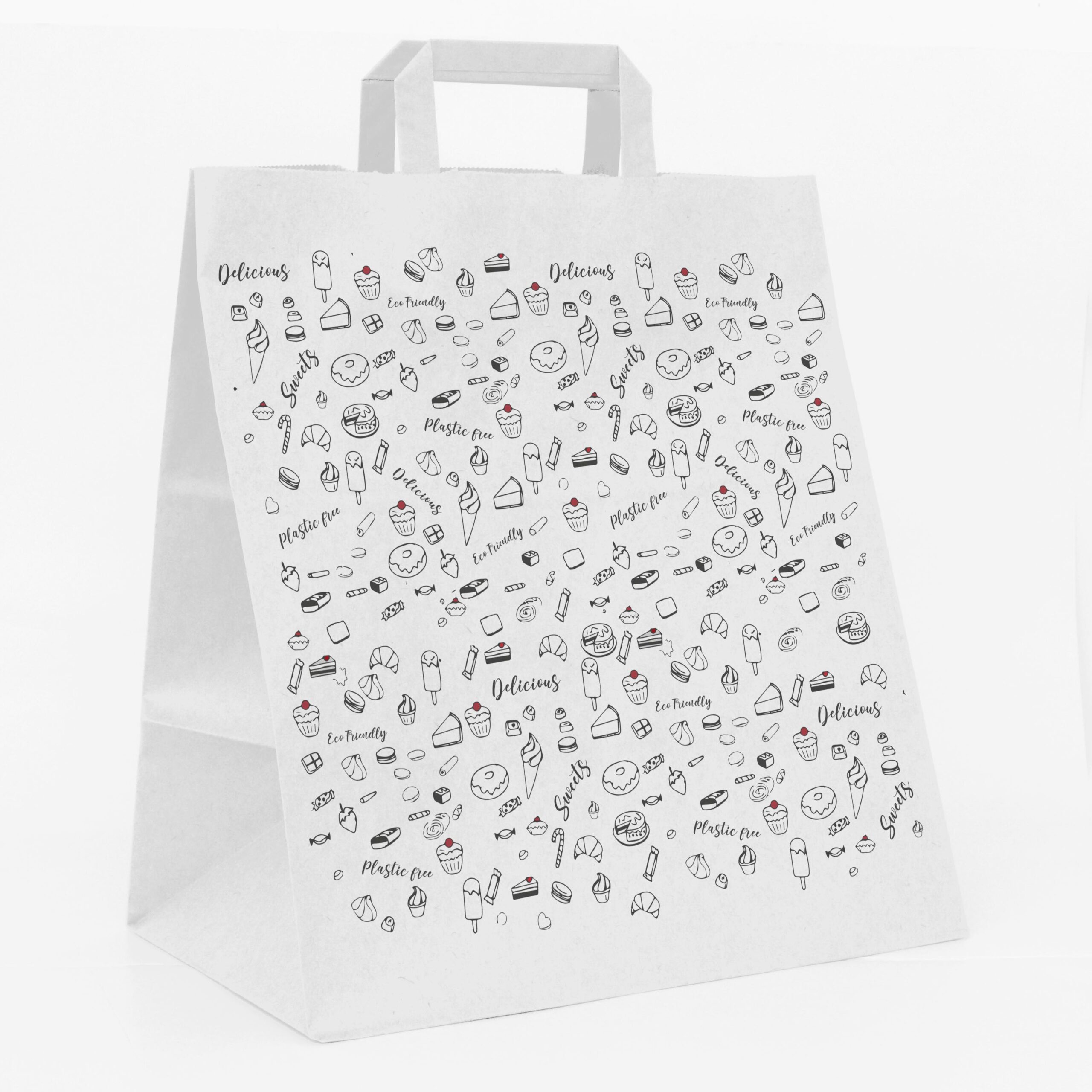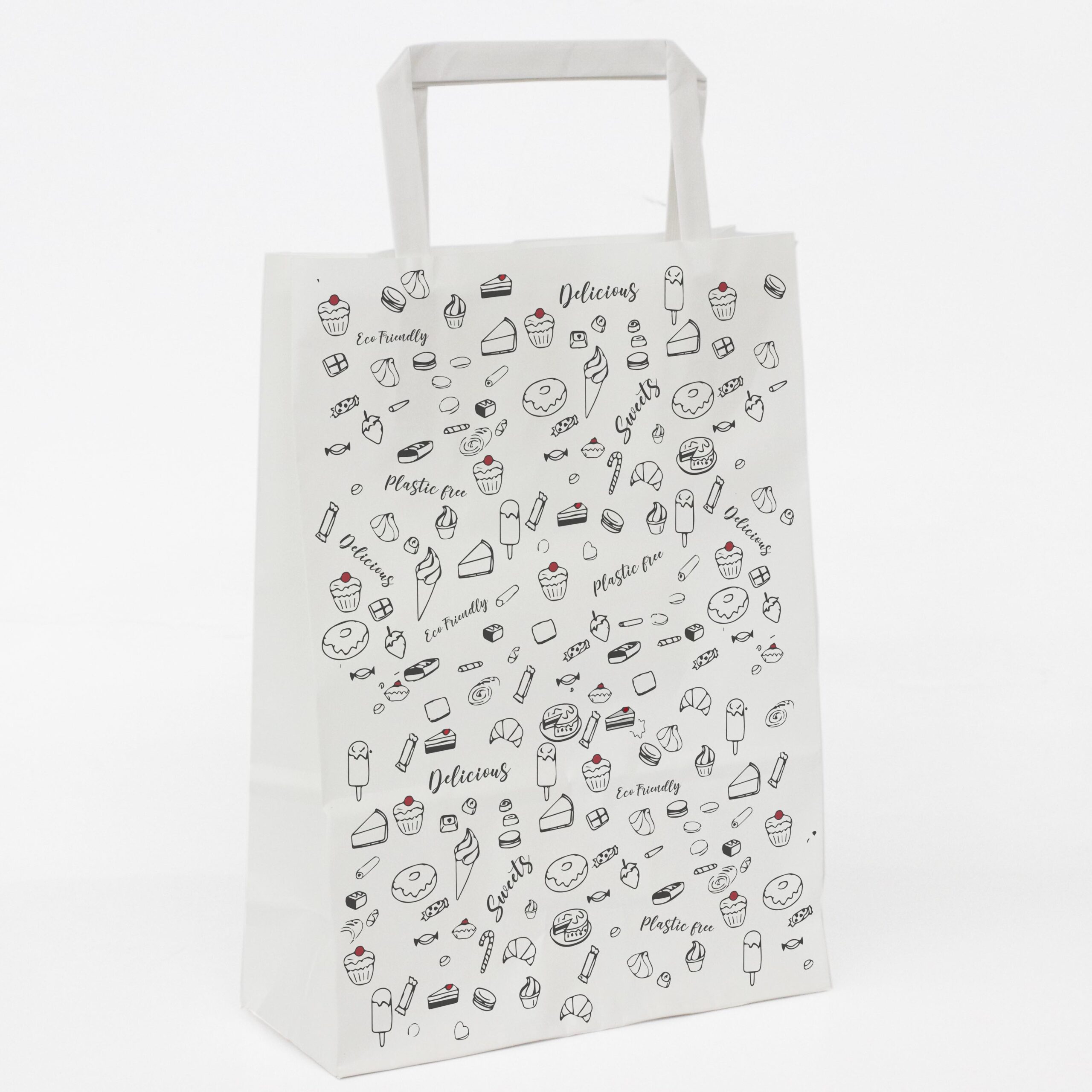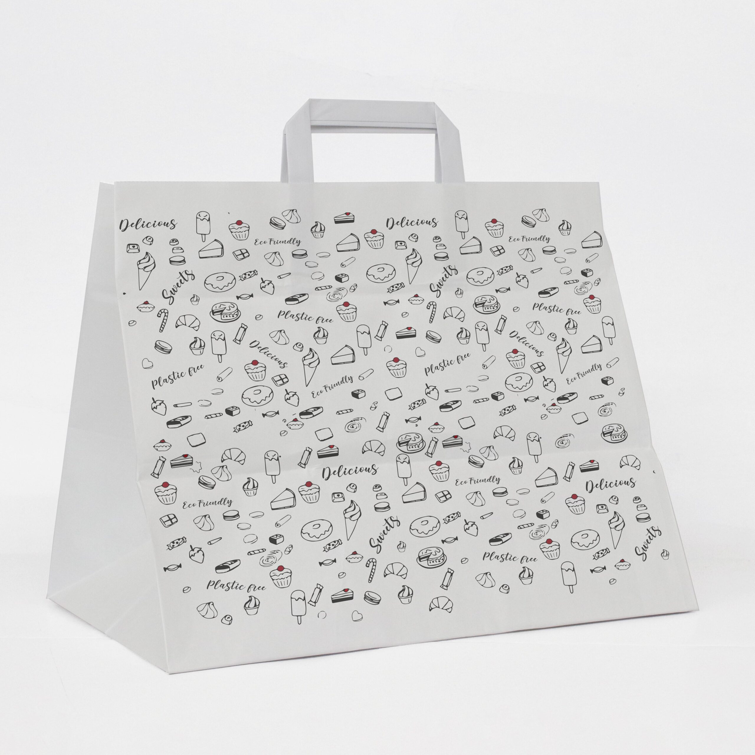 50pz Shopper in Carta Kraft Bianco Stampa sweet Manico Piattina – Varie Misure