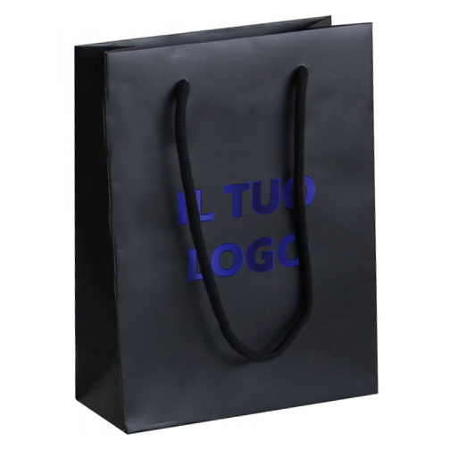 Shopper con manico cordino in tinta , realizzata a mano in carta rigida gr 190 con plastificazione opaca con rinforzo sul bordo superiore e sul fondo. Misure disponibili:14+8x15 18+8x24 23+10x20 26+11x31 35+12x27 42+13x36 54+15x45NB: per questo prodotto è possibile personalizzarlo con stampa a caldo per un preventivo contattare tramite email per ricevere un preventivo.