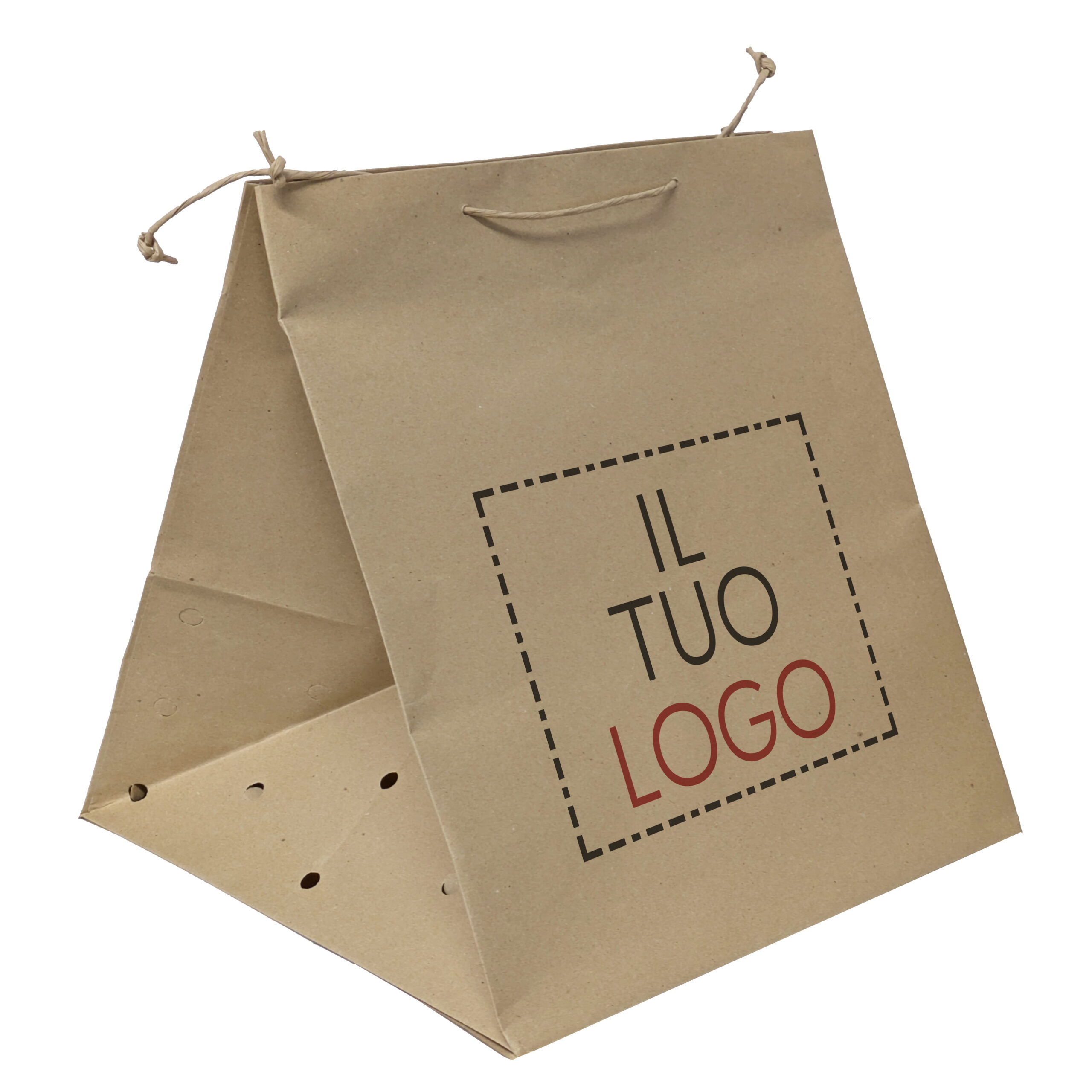 Shopper take away per asporto scatole pizza , fondo rinforzato e fori sui lati per la fuori uscita del vapore, utile per il trasporto di qualsiasi articolo grazie al fondo largo.| Colore | Avana |